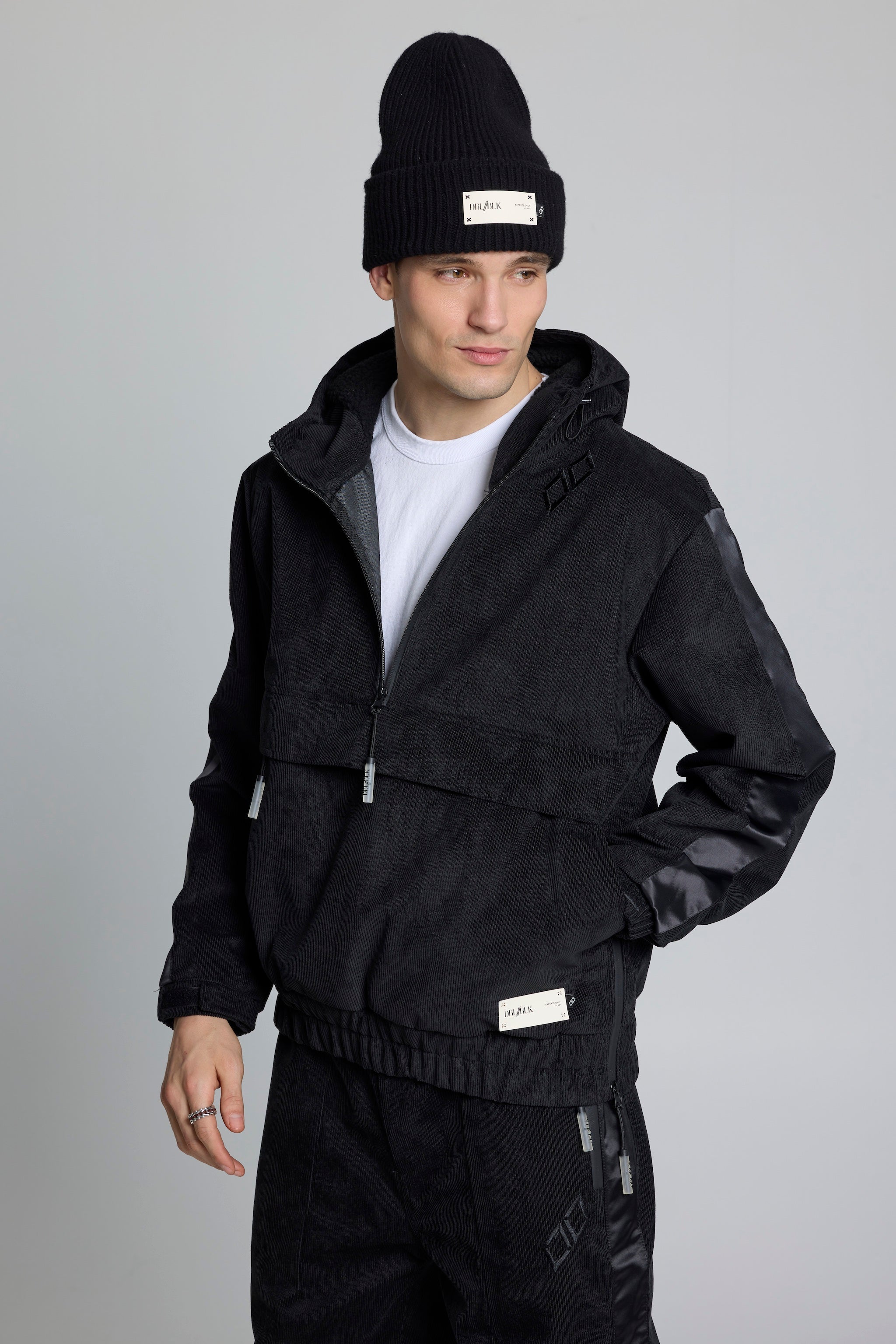 Constructed from waterproof and windproof laminated corduroy fabric, this pullover delivers reliable protection against snow, wind, and variable mountain weather. The water-repellent exterior supports outdoor performance while maintaining a refined, architectural finish.