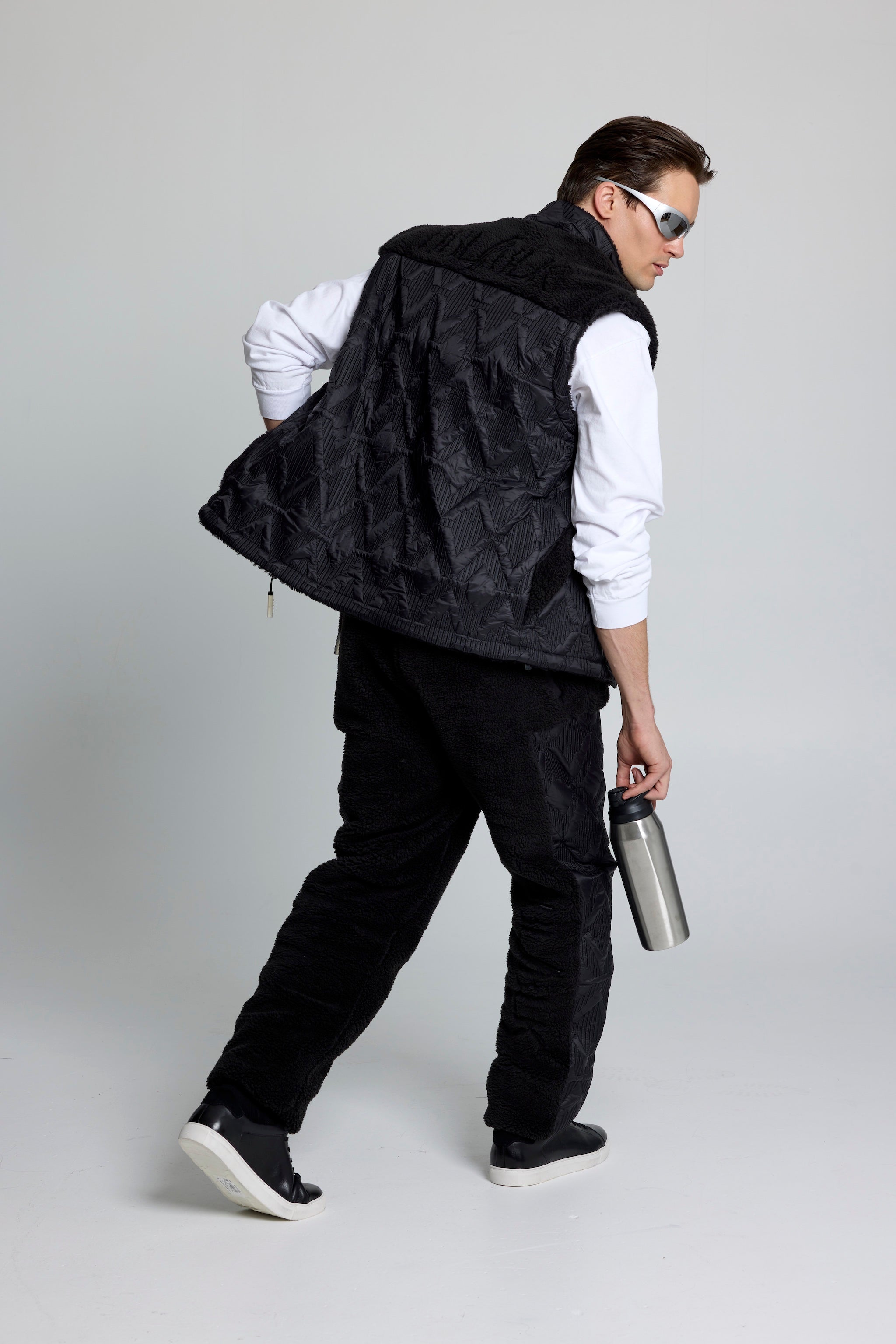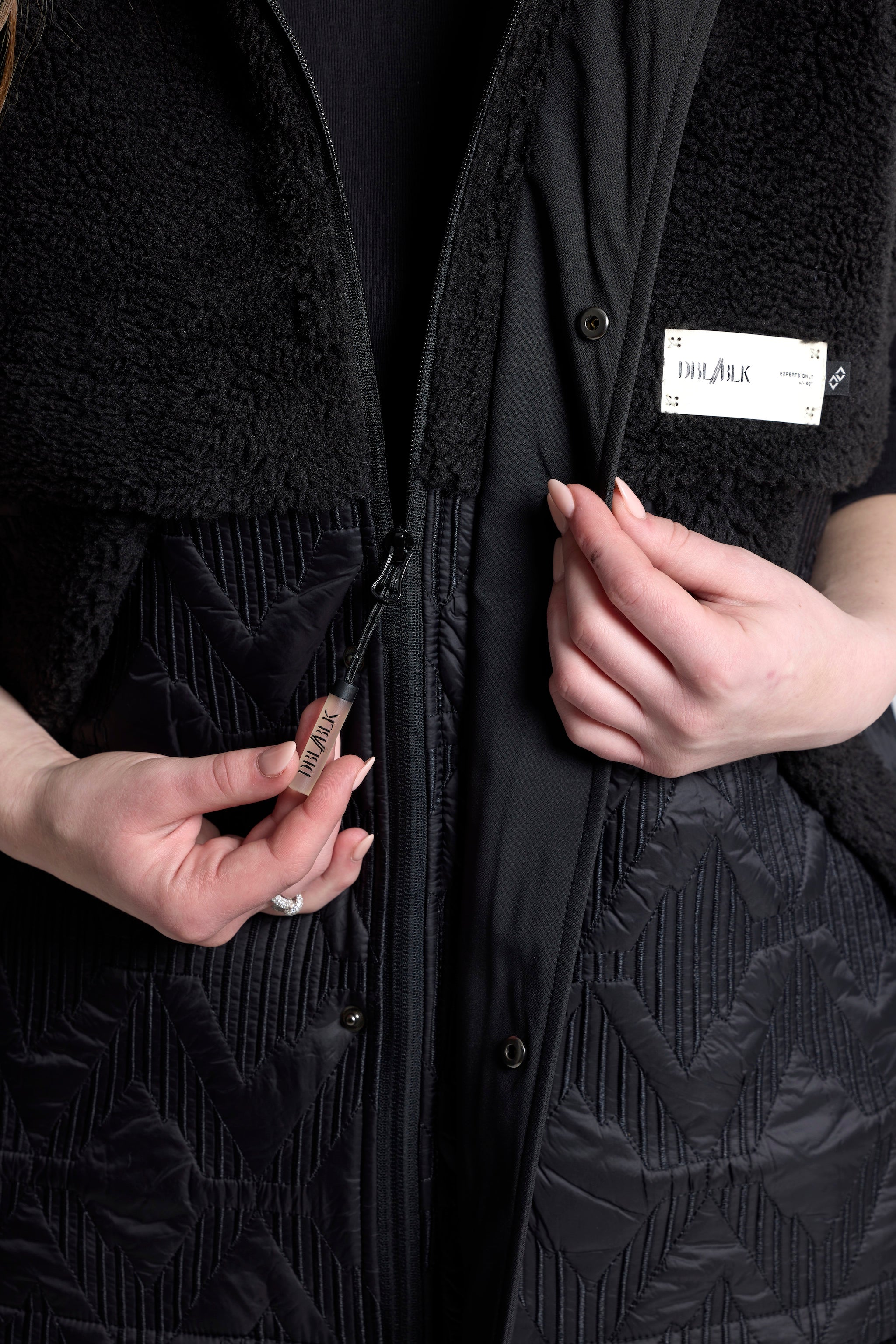 This padded vest combines high-loft 100% polyester sherpa with diamond-quilted nylon panels for balanced warmth and durability. The sherpa lining and polyfiber insulation layer enhance heat retention while maintaining lightweight comfort for movement and all-day wear.